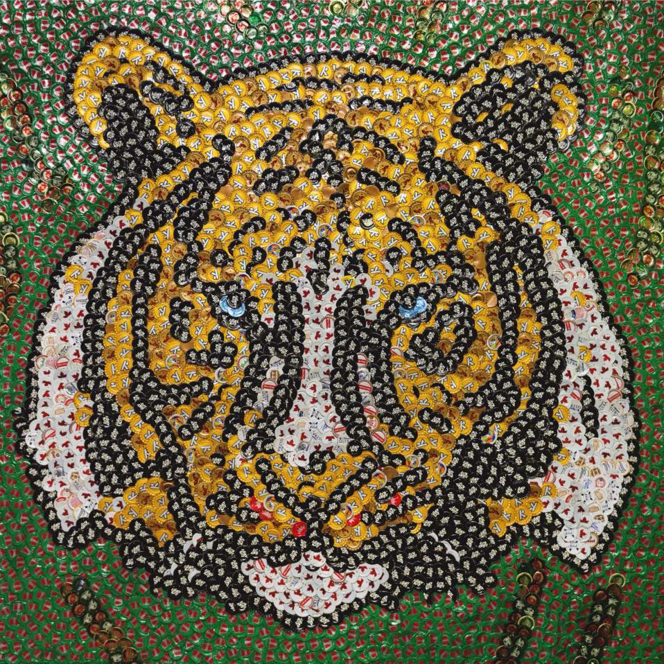 I had a part time job bartending throughout my music career and I noticed how many bottle caps and corks were being thrown out. To me, these were colourful and unique pixels of art. So I started saving them, not exactly sure how I would use them, but I knew it had to be in mosaic form. I started a long trial and error process of figuring out whether or not to flatten the caps, how to fasten them, and what to fasten them to. This took me a few years to get my technique down in an efficient manner, but I've been doing this artwork since 2014 and I feel like I have really found my style.